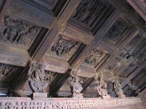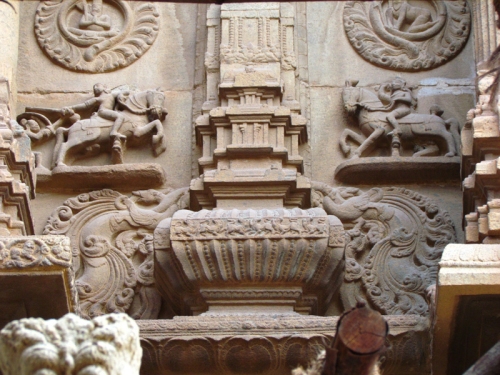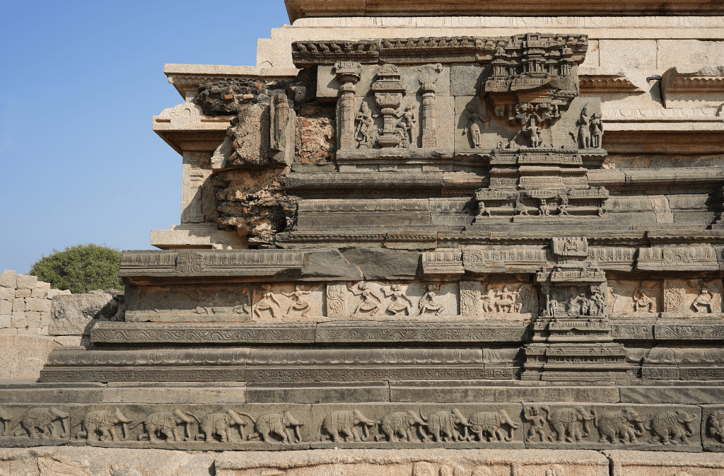 for intricately carved interior elements in limited areas, outside of the majority being granite carvings, such as these granite friezes on the Vitthala Temple in Hampi, which is similar to Tamil temples, though with a different color of granite – more light brown-pink in tone, while Tamil temples have a dark brown, black appearance. See the examples below of the Vitthala Temple in Hampi, Karnataka: