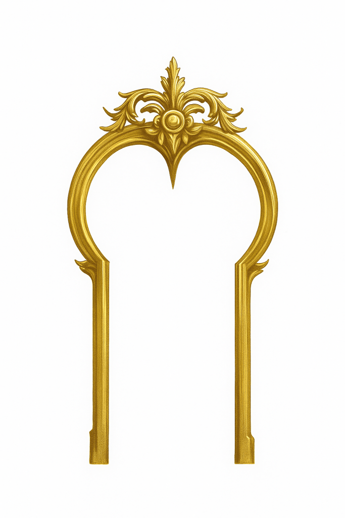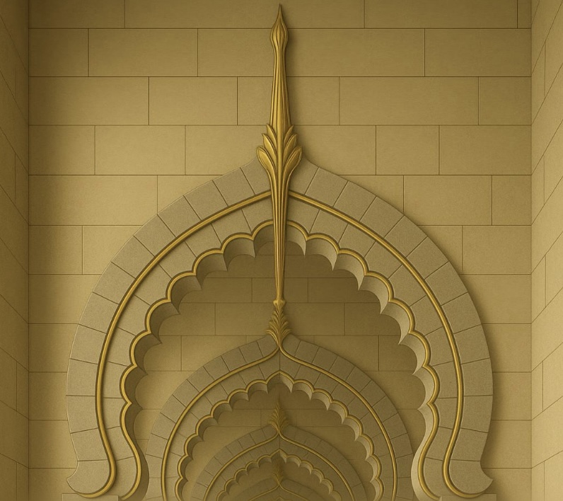 I wanted to create an arch that’s Southern Indian in origin – while being a design that would be agnostic – able to be used pan-culturally. I took the long, central arrow-like keystone from the Kerala Gable and transposed it onto the scalloped horseshoe arch.