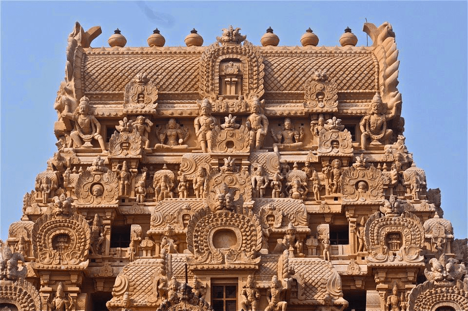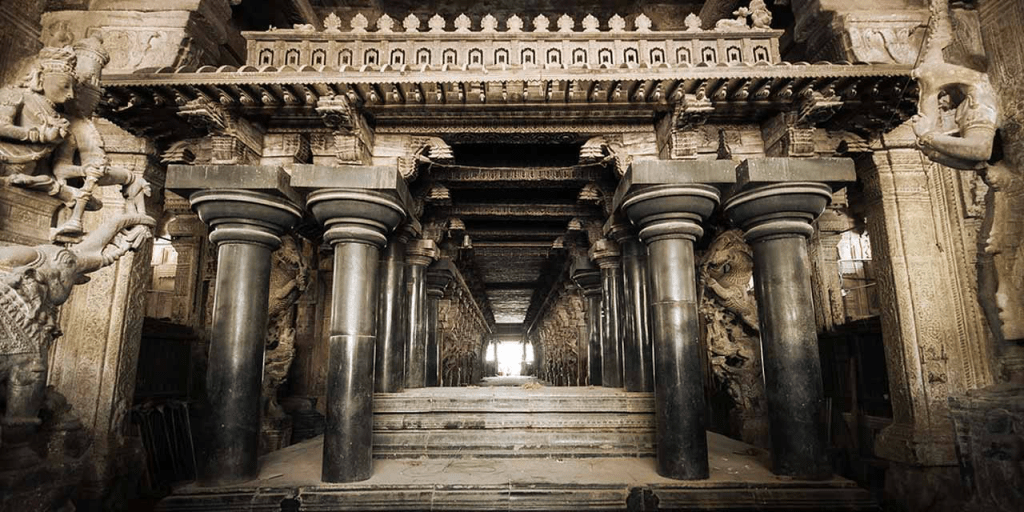 - Granite – as bases of gopurams, the full structure of the Great Living Chola temples aside from the Nayak and Maratha additions, and the interiors of the temples, particularly all throughout Tamil Nadu. Granite is the most abundant building stone of Tamil Nadu, and it’s both highly durable and resistant to mold in monsoon weather, allowing it to last through millenia. Most of Tamil Nadu’s interior architectural heritage in temples and other monumental structures is largely based on granite construction.