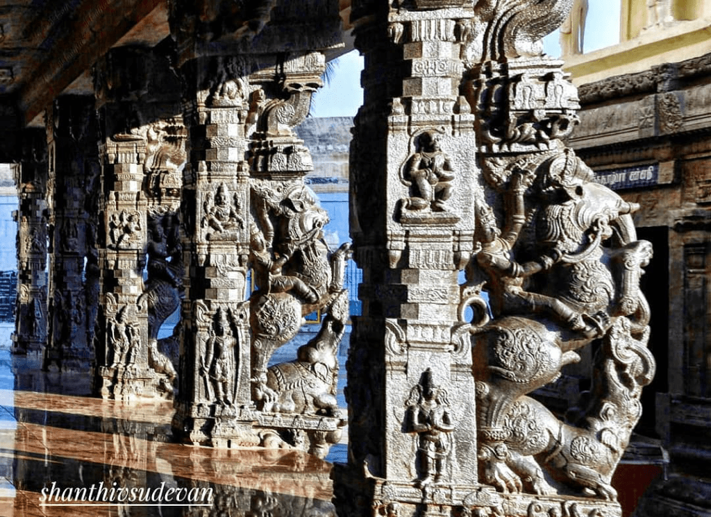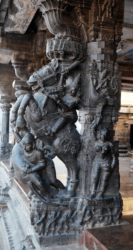 used at Sri Rama Temple in Salem, while used in it’s most developed & grand form in temples such as the Nellaiappar Temple in Tirunelveli, and the Thanumalayan Temple in Suchindram. Sculptures of persona can be added to the layered pillars, as shown below, with floral designs on the base of the pillars: