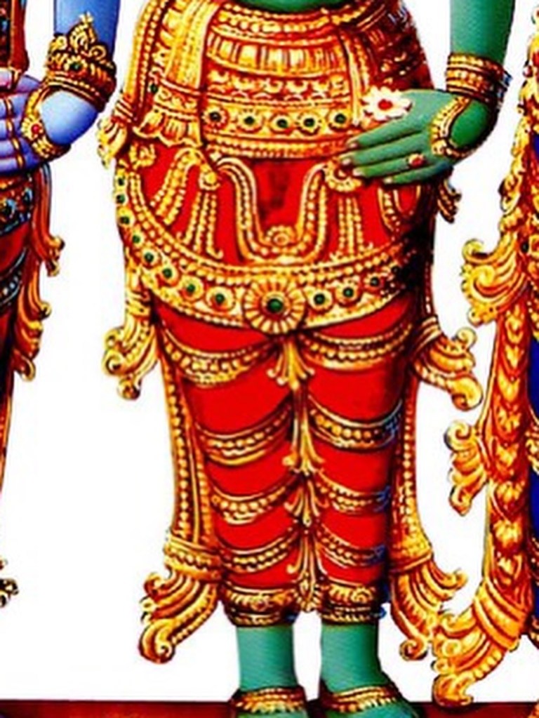 This is a stylized example of a veshti with a Oddiyanam, with emeralds set in. She wear anklets with the luxurious silk veshti. We could use this combination today, with high-luxury, glamorous form.